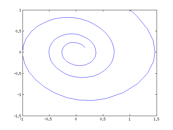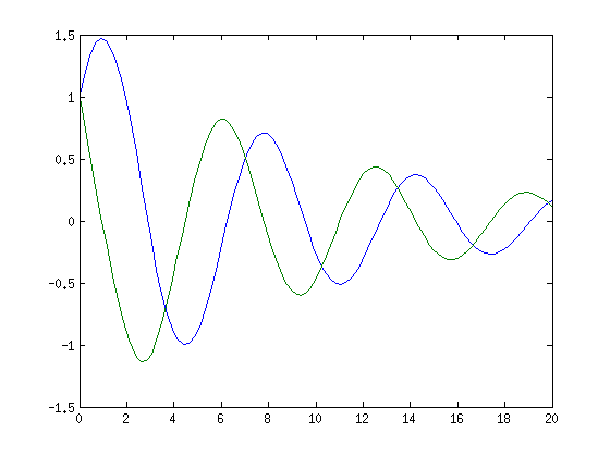 k=1; c=0.1; % Vaimennusvakio, Vaihdellaan. c=0.2; % vaiheiluri=@(t,y) [y(2);-k*sin(y(1))-c*y(2)] Tvali=[0 20]; y0=[1;1]; % Alkukulma=1, alkukulmanopeus=1. [T,Y]=ode45(vaiheiluri,Tvali,y0); % ode45 havaitsee funktiokahvan, sille % ei tarvitse sitä enää @-merkillä % ilmoittaa. (Muistisääntö 1 @-merkki % joko määrittelyssä tai kutsussa, ei molemmissa.) size(T) % Aikapistevektorin pisteiden lkm. size(Y) % Kaksisarakkeinen matriisi, ratkaisut y1 ja y2 aikapisteissä t. plot(T,Y(:,1),T,Y(:,2)) % Aikakuva: heilahduskulma ja kulmanopeus ... % ajan funktiona figure plot(Y(:,1),Y(:,2)) % Faasikuva: Kulmanopeus kulman "funktiona" ... % eli käyrä (Theta(t),omega(t)), 0< t < 20).
