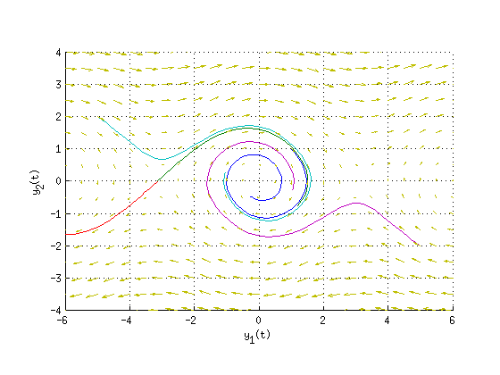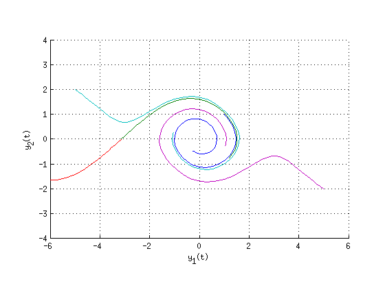 close all ya0=[1;1]; % Pieni alkukulma/nopeus -> heilahtelee edestakaisin yb0plus=[-pi;0.01]; % Kriittinen alkutilanne (Heiluri pysytyasennossa+) yb0miinus=[-pi;-0.01]; % Kriittinen alkutilanne (Heiluri pysytyasennossa-) yc0=[-5;2]; % Suuret alkuarvot, heiluri pyörii ympäri yd0=[5;-2]; % ... toisinpäin Tvali=[0 10]; [ta,Ya]=ode45(vaiheiluri,Tvali,ya0); [tbplus,Ybplus]=ode45(vaiheiluri,Tvali,yb0plus); [tbmiinus,Ybmiinus]=ode45(vaiheiluri,Tvali,yb0miinus); [tc,Yc]=ode45(vaiheiluri,Tvali,yc0); [td,Yd]=ode45(vaiheiluri,Tvali,yd0); hold on plot(Ya(:,1),Ya(:,2),Ybplus(:,1),Ybplus(:,2),Ybmiinus(:,1),Ybmiinus(:,2),... Yc(:,1),Yc(:,2),Yd(:,1),Yd(:,2)) axis equal; axis([-6 6 -4 4]) xlabel y_1(t); ylabel y_2(t) grid on